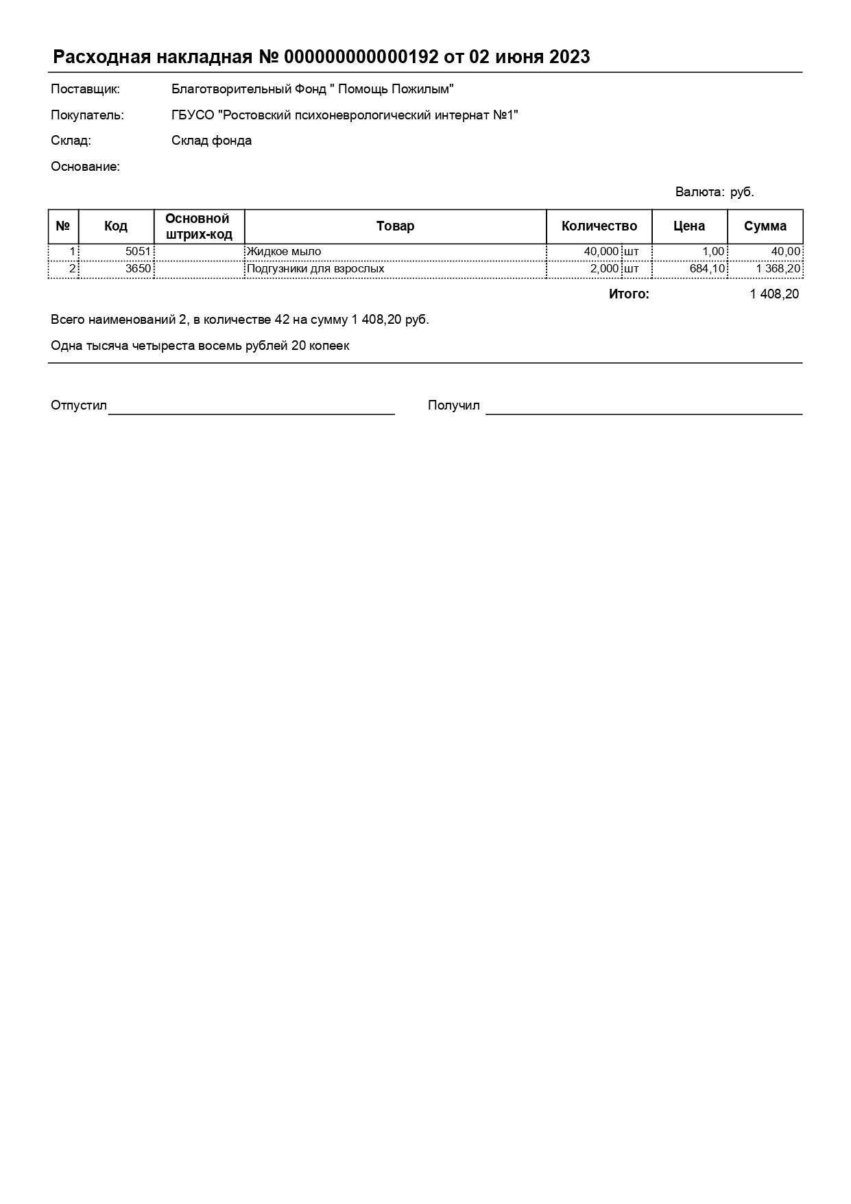 10 июня 2023 г. была отправлена благотворительная помощь для Ростовского психоневрологического интерната № 1 в виде жидкого антибактериального мыла "Айкап", подгузников и вещевого резерва.