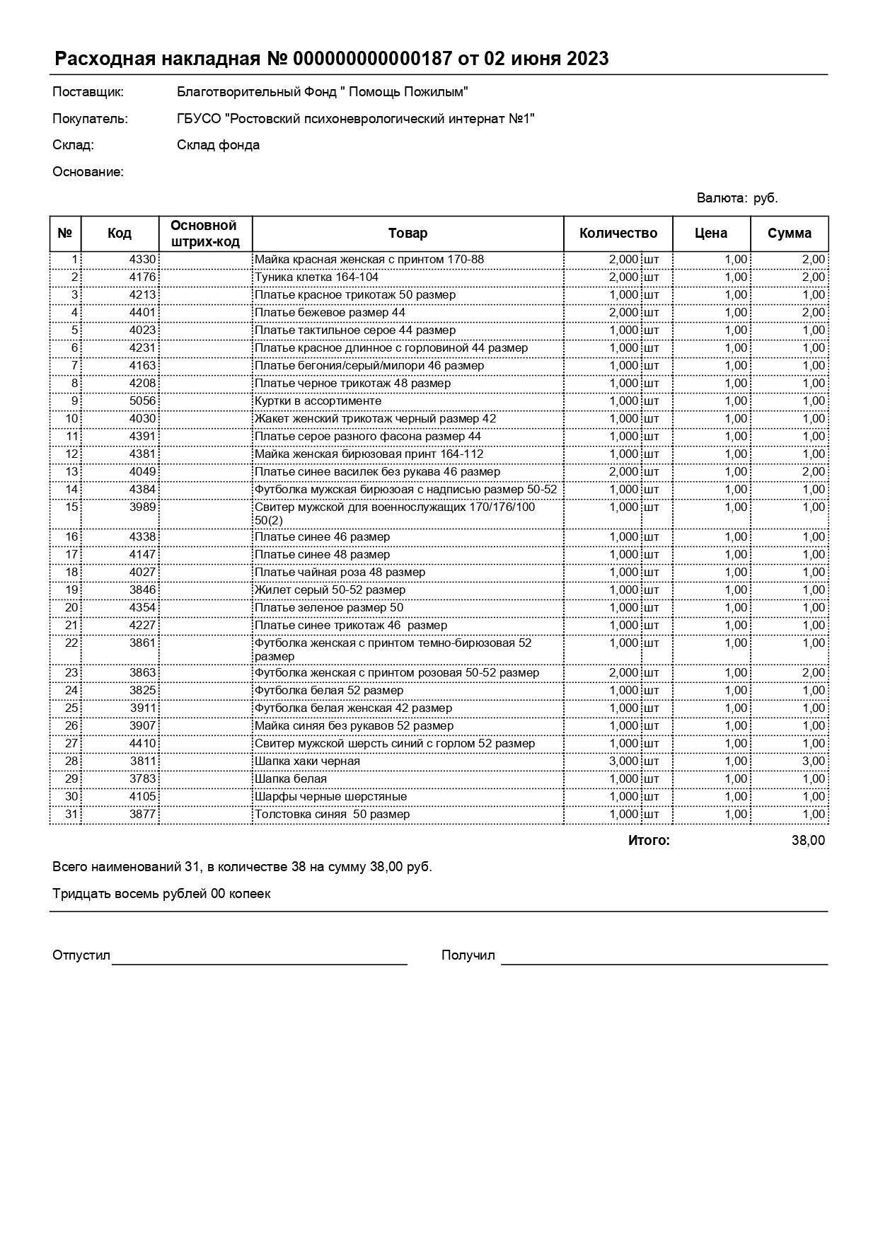 В мае 2023 г. в Фонд поступила заявка от ГБУСОН РО "Ростовского психоневрологического интерната № 1" с просьбой выделить вещевой резерв и средства гигиены. Совет фонда принял решение удовлетворить заявку данного учреждения.