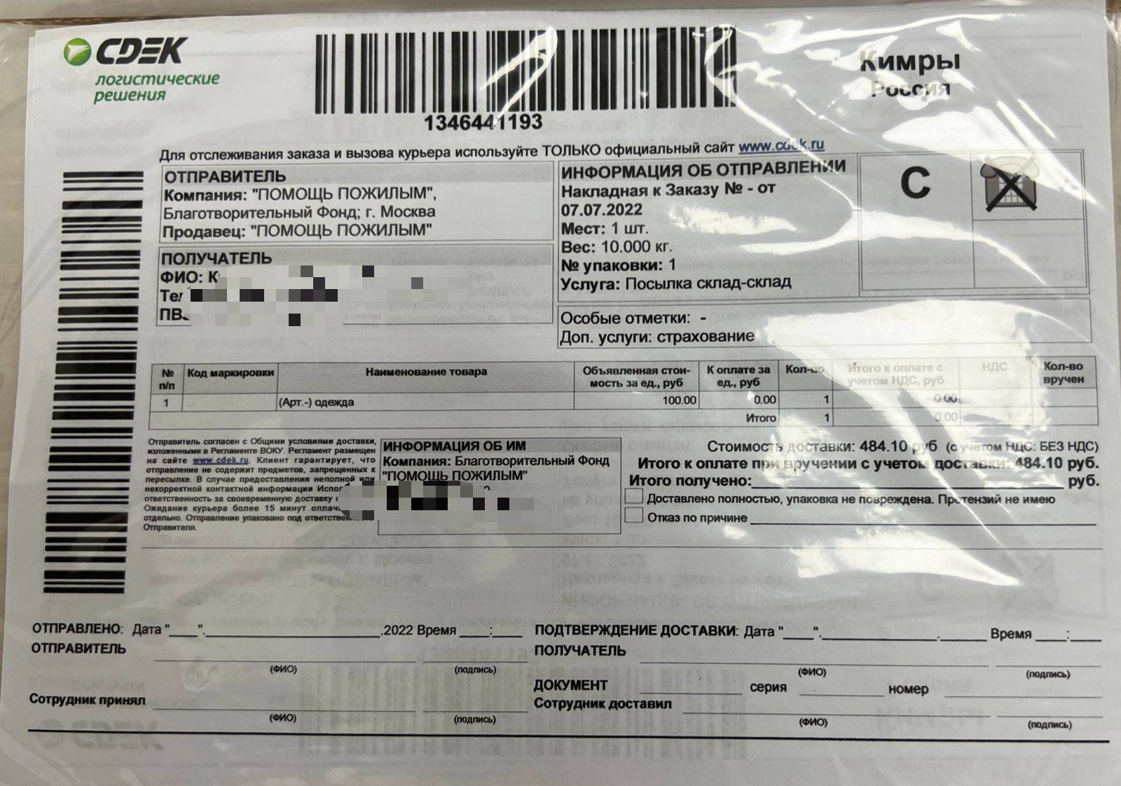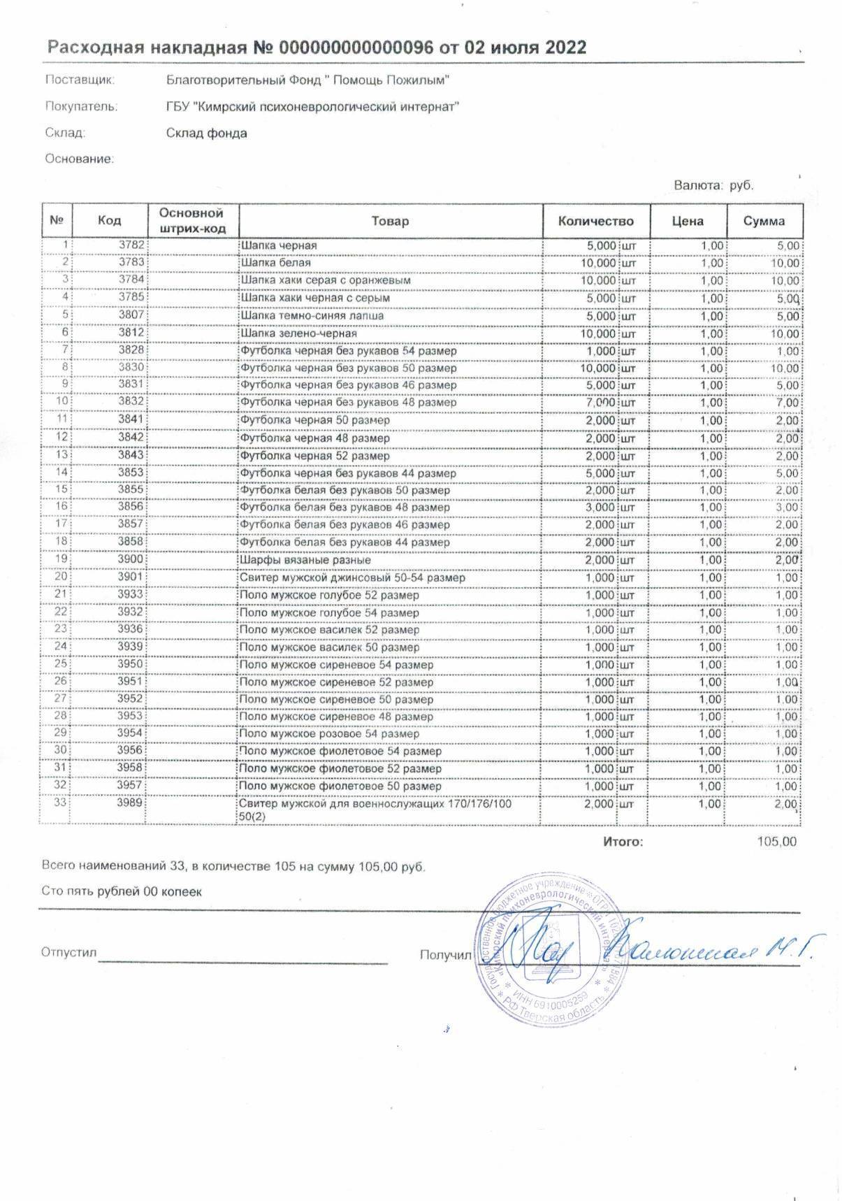 08 июля 2022 г. Фонд отправил вещевую помощь для подопечных психоневрологического интерната г. Кимры.