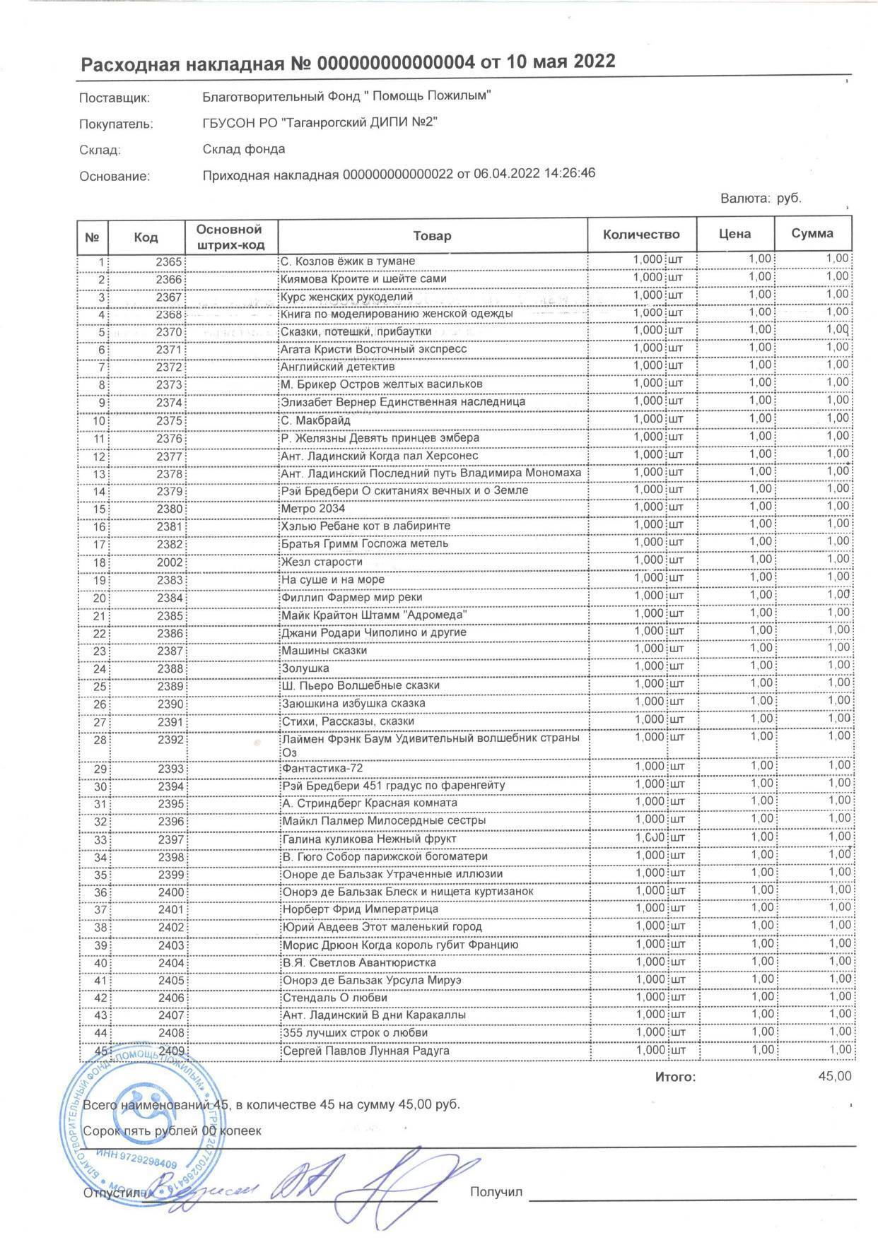 Для получателей социальных услуг ГБУСОН РО "Таганрогского ДИПИ №2", согласно поступившей заявки в Фонд, предпочтительнее обновить книжный фонд следующими жанрами книг: детективы -15 шт., фантастика -10 шт., любовные романы -10шт, рукоделие -5 шт., исторические романы- 5 шт. и как ни странно сказки (10 шт.). Количество проживаемых – 350 человек.