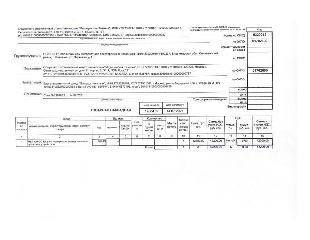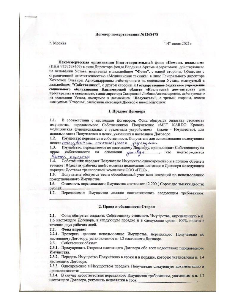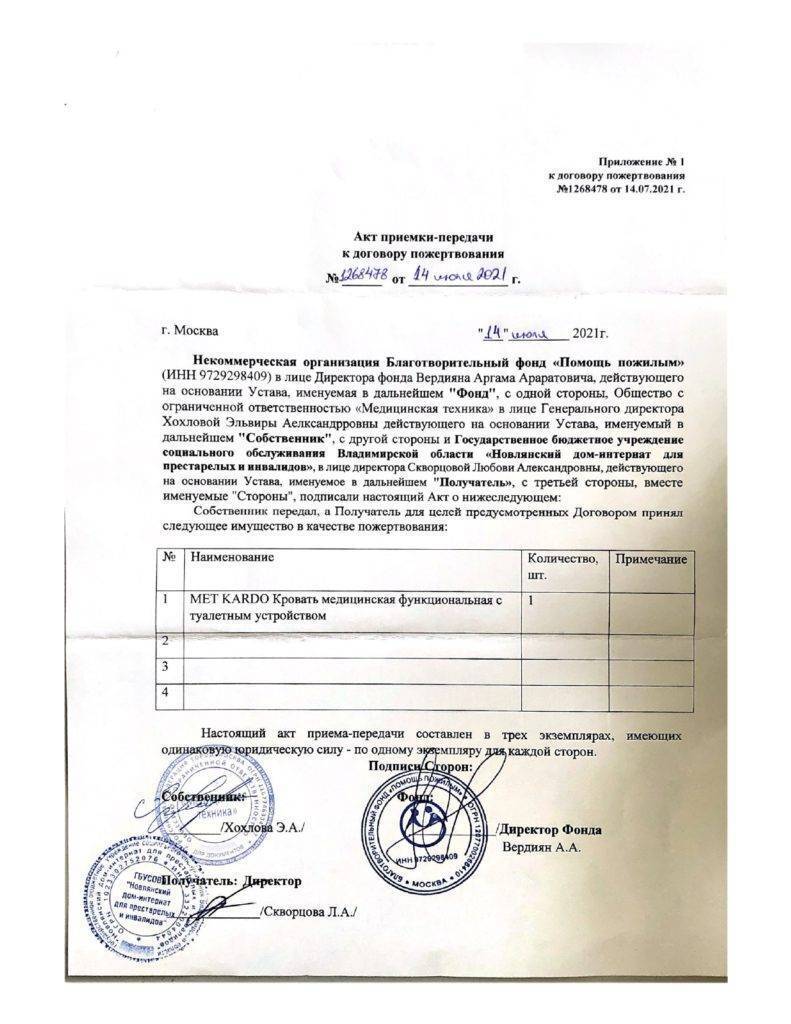 02 апреля 2021 года в Фонд поступила заявка от Новлянского дома-интерната на приобретение средств реабилитации. Совет фонда в течении 30 дней рассматривает все поступающие обращения, запрашивает пакет документов, необходимых для заключения соглашения. 02 июня 2021 года между ГБУСОВО “Новлянский дом-интернат для престарелых и инвалидов» и нашим фондом было заключено соглашение на осуществление благотворительной деятельности. Получено согласие вышестоящего руководства на работу учреждения с БФ «Помощь пожилым». В рамках данного соглашения Фонд приобрел медицинскую функциональную кровать с туалетным устройством. Кровать крайне важна для проведения гигиенических процедур и купания маломобильных людей.