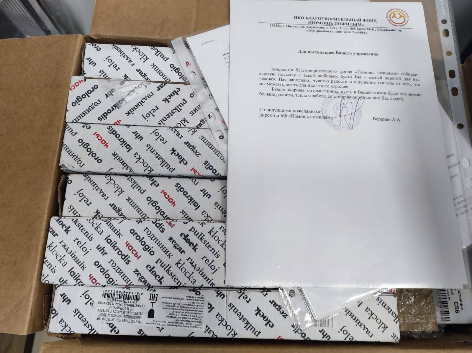 Для одиноких бабушек и дедушек были отправлены картины для жилых комнат, настенные часы, шагомеры, наборы для творчества, прогулочную инвалидную коляску, ходунки, трости.