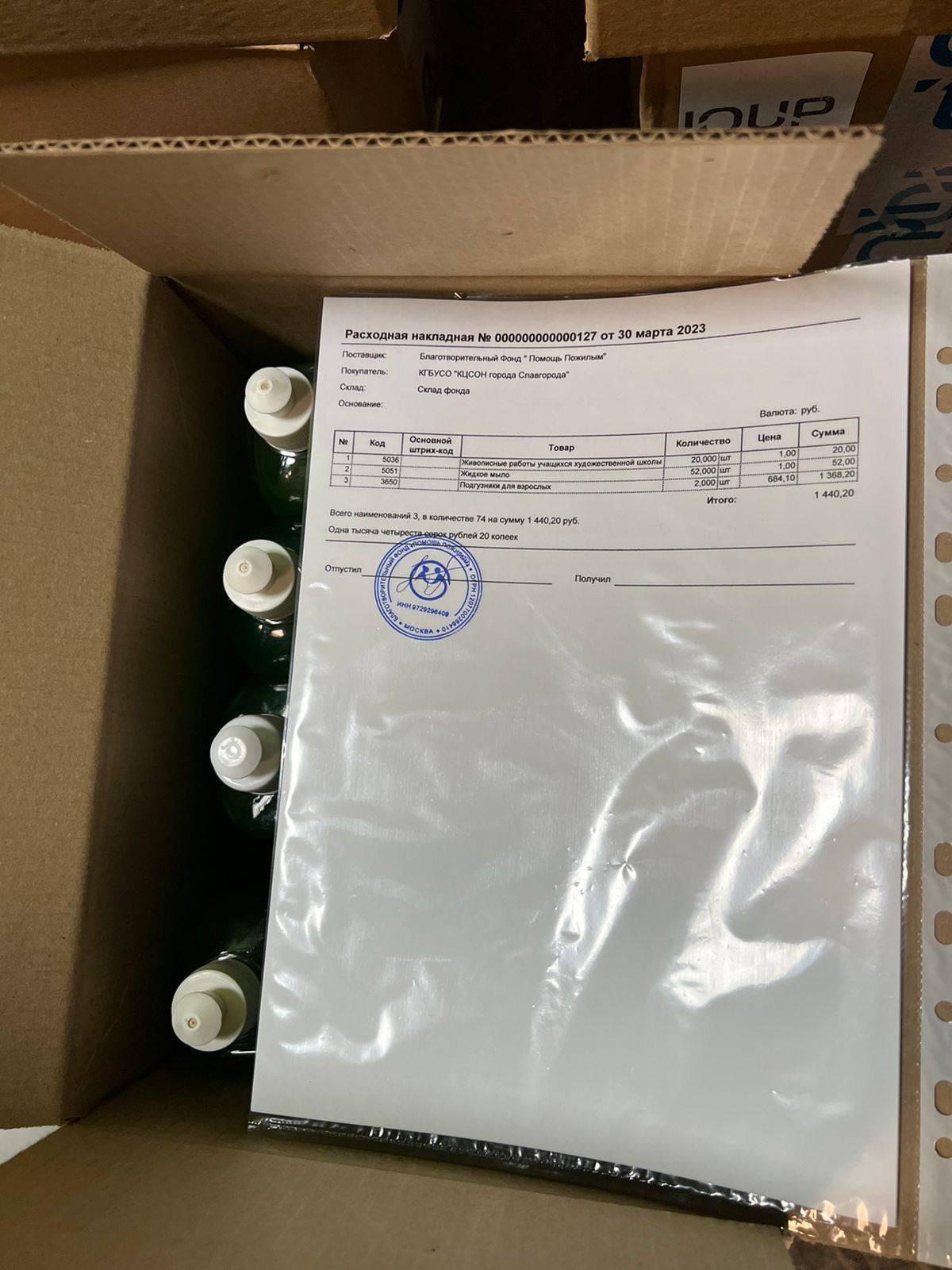 05 апреля 2023 г. Фонд отправил три коробки с жидким антибактериальным мылом, а также коробку с подгузниками и картинами для одиноких бабушек и дедушек, находящихся в стационаре в КГБУСО КЦСОН г. Славгорода.