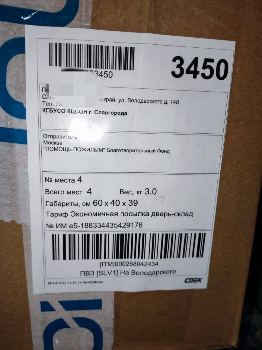 В стационарном отделении КГБУСО КЦСОН г. Славгорода на обслуживании находится 65 человек. Для улучшения качества жизни проживающих, Советом Фонда было принято решение об оказании помощи данному учреждению. 05 апреля 2023 г транспортной компанией были отправлены три коробки с жидким антибактериальным мылом и одна коробка с подгузниками и картинами.