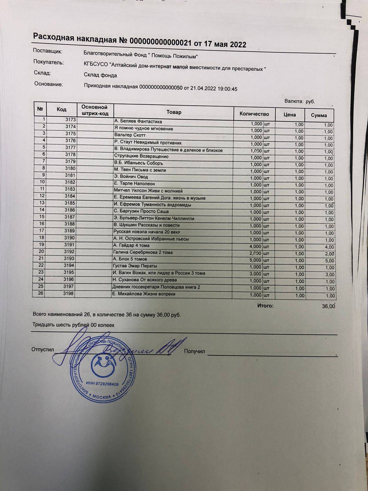 Уважаемые сотрудники благотворительного фонда "Помощь пожилым" . Жители Алтайского дома-интерната для престарелых и инвалидов благодарят вас за художественную литературу. Посылка с книгами пришла в целости. Книги в хорошем состоянии и займут достойное место на полках нашей библиотеки.