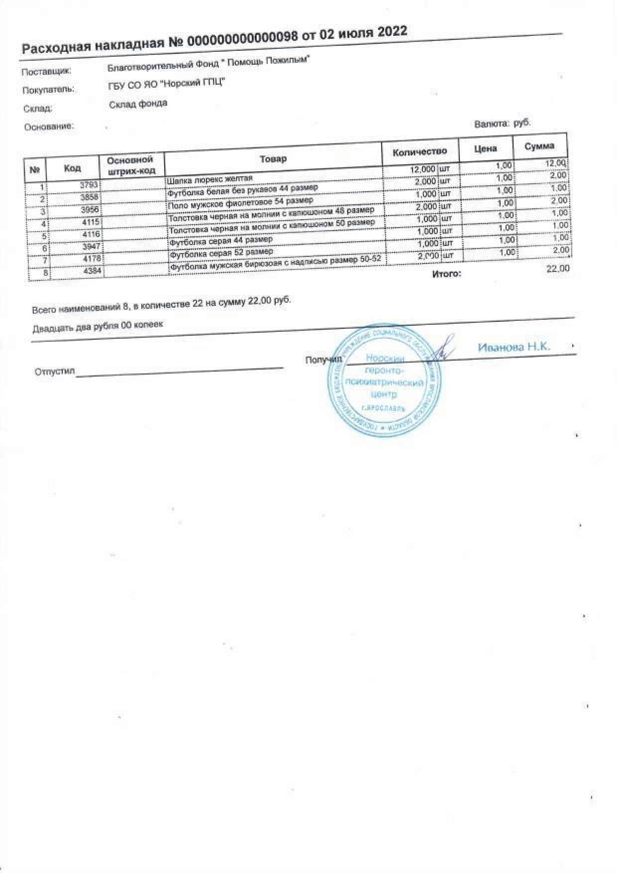 Многие считают, что у пожилых людей, проживающих в домах пресарелых все есть, что они ни в чем не нуждаются. Есть медицинский уход, хорошее питание, но заботы и внимания всегда не хватает. Особенно приятно получить внимание в виде материальных ценностей, которые будут радовать долгие годы. Согласно поступившей в июне заявки, 12 июля 2022 г. Фонд отправил вещевой резерв для проживающих Норского геронтопсихиатрического центра.