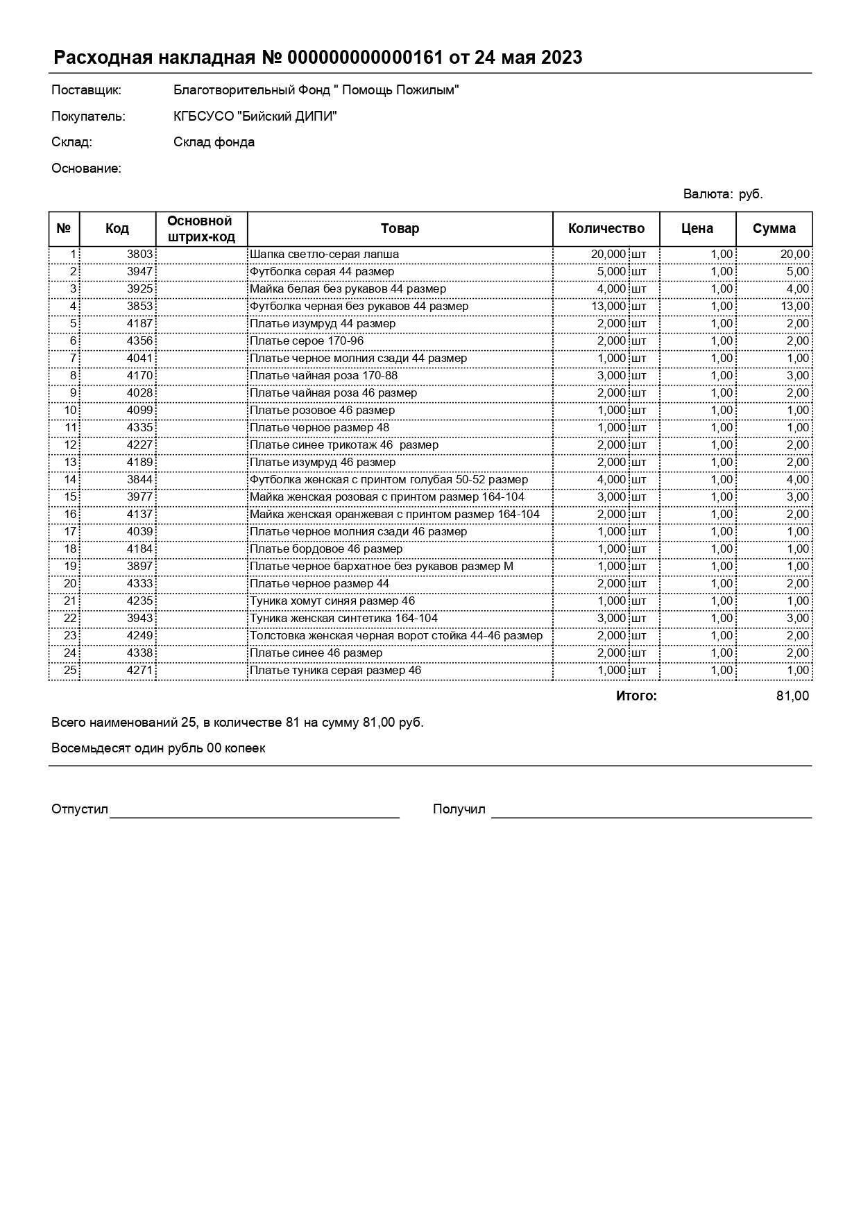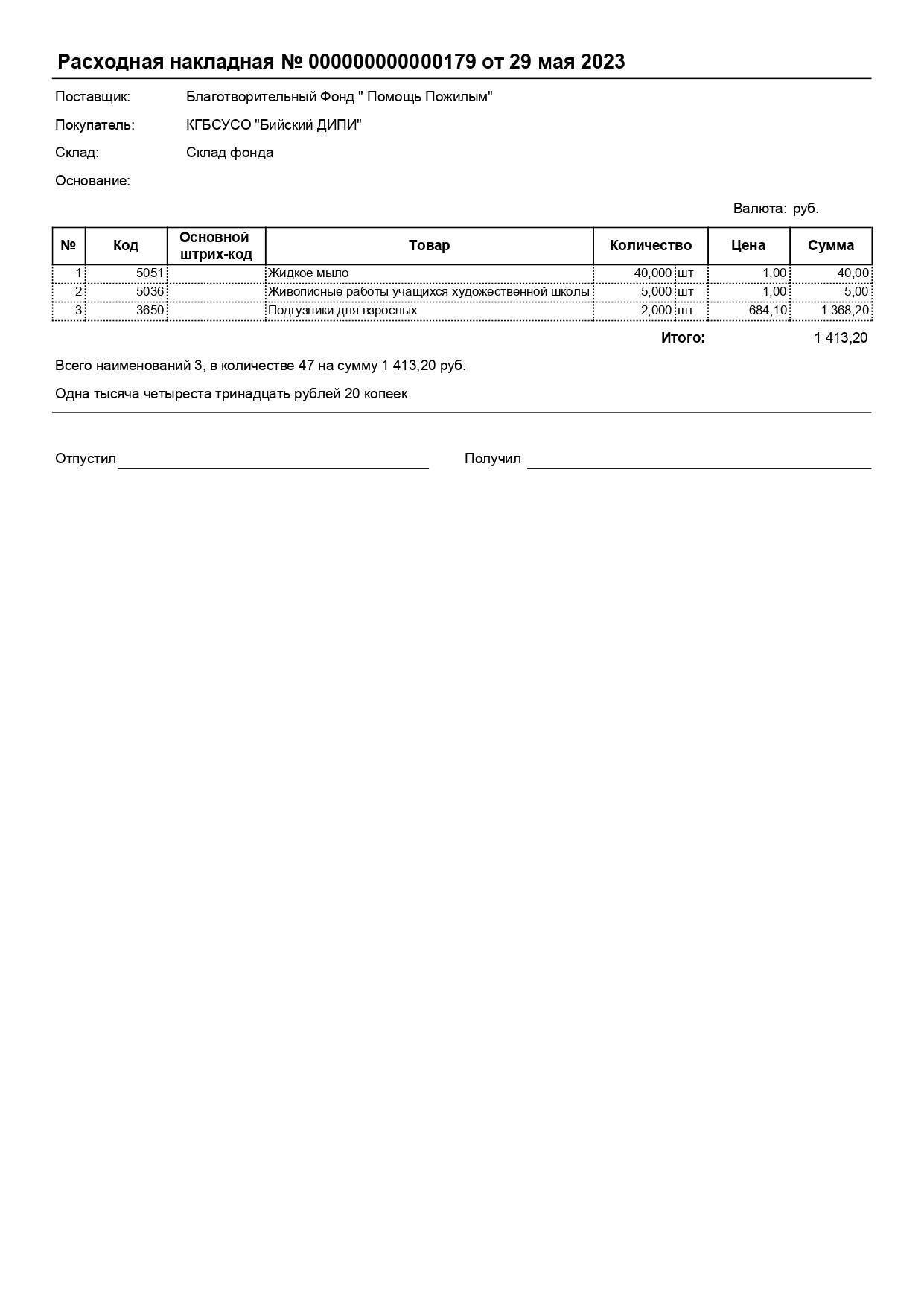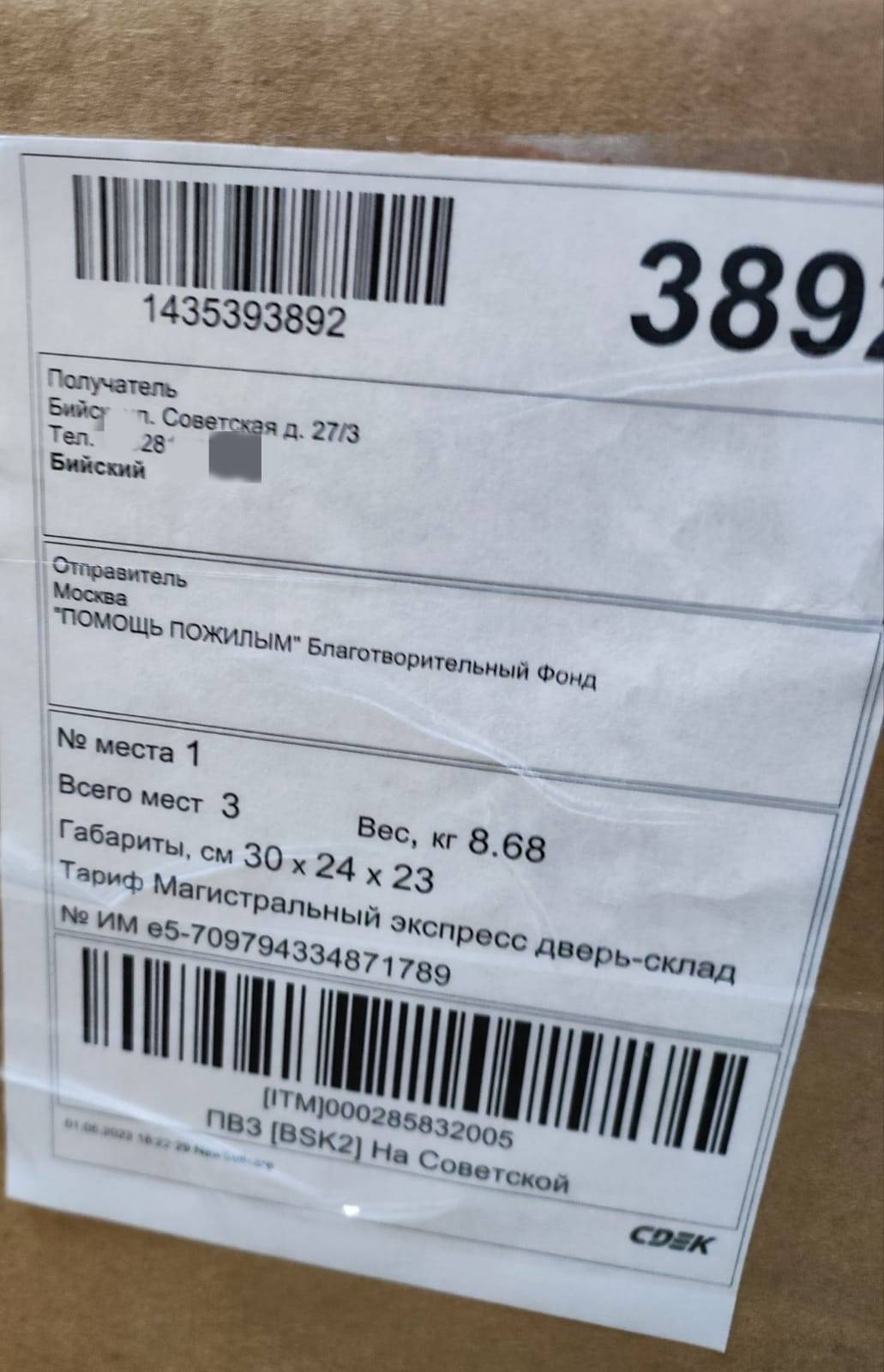 01 июня 2023 г. Фонд отправил благотворительную помощь для подопечных КГБСУСО "Бийского дома-интерната для престарелых и инвалидов". Учреждение  получила помощь в виде интерьерных картин, подгузников, жидкого мыла компании ООО "Айкап" и вещевого резерва.