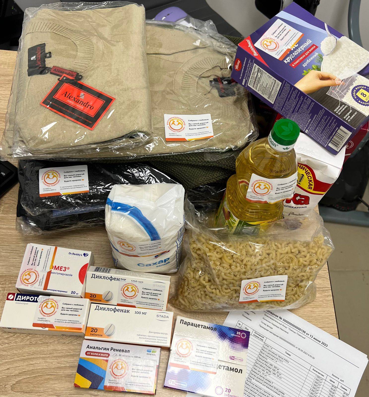 13 июня 2023 г. Почтой России была отправлена благотворительная помощь для семью Колесник из Ростовской области. Фонд отправил новые вещи для Надежды Ивановны и Николая Александровича, медикаменты, продукты питания.