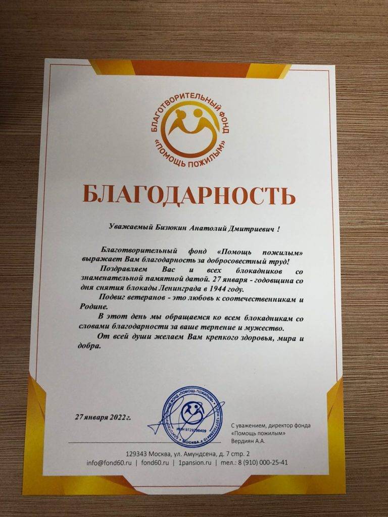 В преддверии этого праздника наш Фонд отправил благодарственное письмо и продуктовую посылку для Бизюкина Анатолия Дмитриевича.