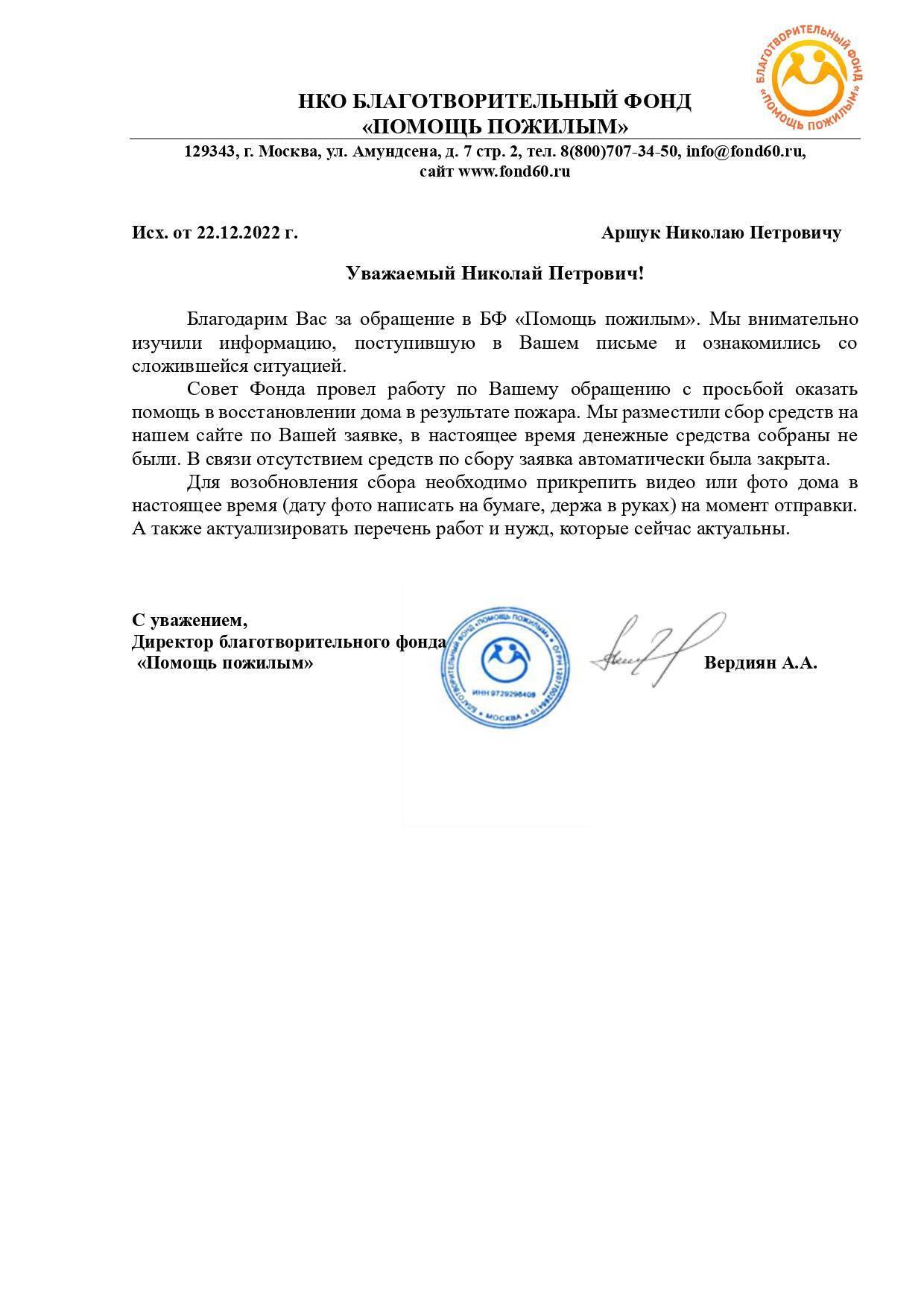 22 декабря 2022 г. мы отправили письмо на электронную почту семье Аршук с пояснениями по ранее полученному заявлению по оказанию благотворительной помощи. Если по объявленному сбору денежные средства и товары не собираются, заявка закрывается автоматически. Мы предлагаем заявителю продолжить сбор, открыть новый, либо закрыть заявку.
