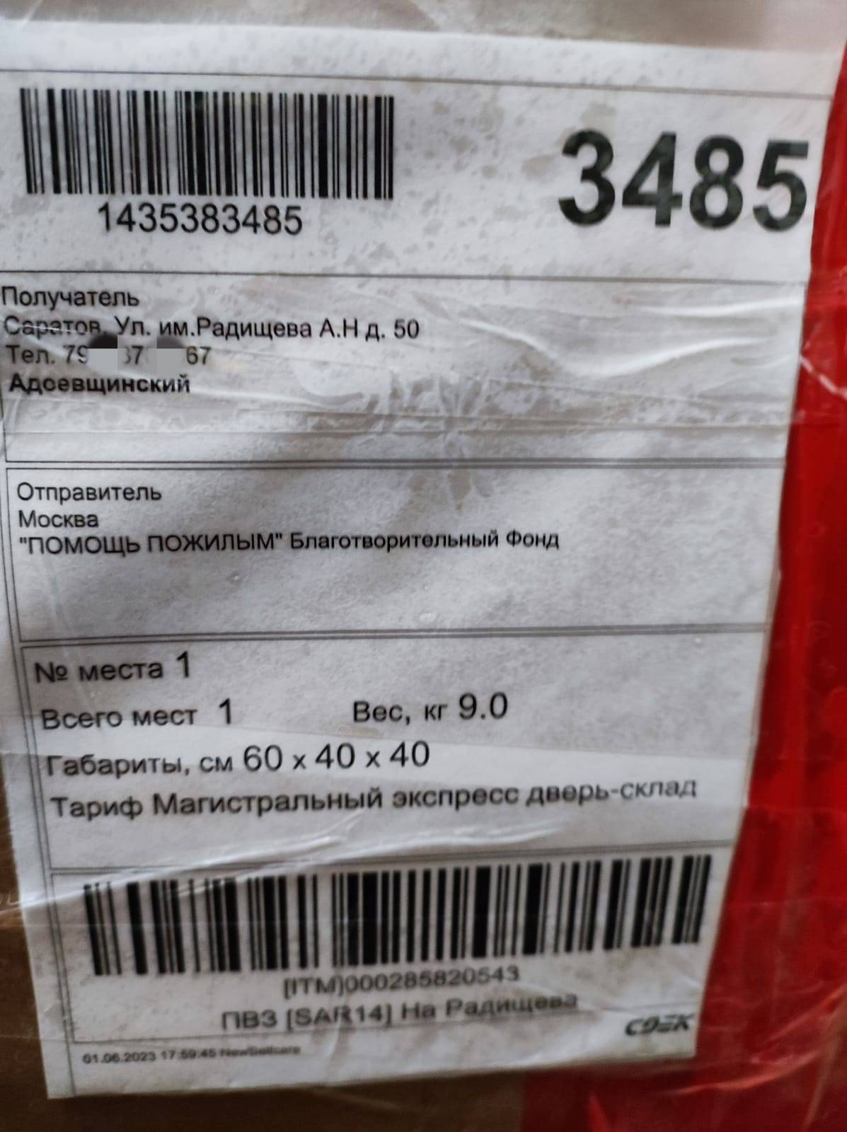 01 июня 2023 г. вещевой резерв был отправлен транспортной компанией.