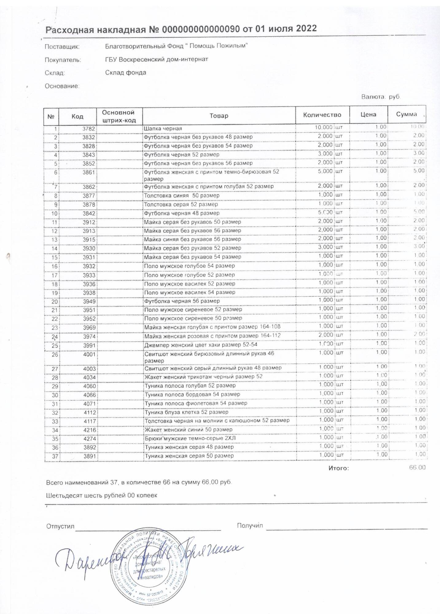 В июне 2022 г. Фонд получил заявку от Воскресенского дома-интерната для престарелых и инвалидов о рассмотрении возможности получить вещевую помощь для своих подопечных. Советом Фонда было принято решение о оказании данной помощи. 08 июля 2022 г. вещи были отправлены ТК "СДЭК".