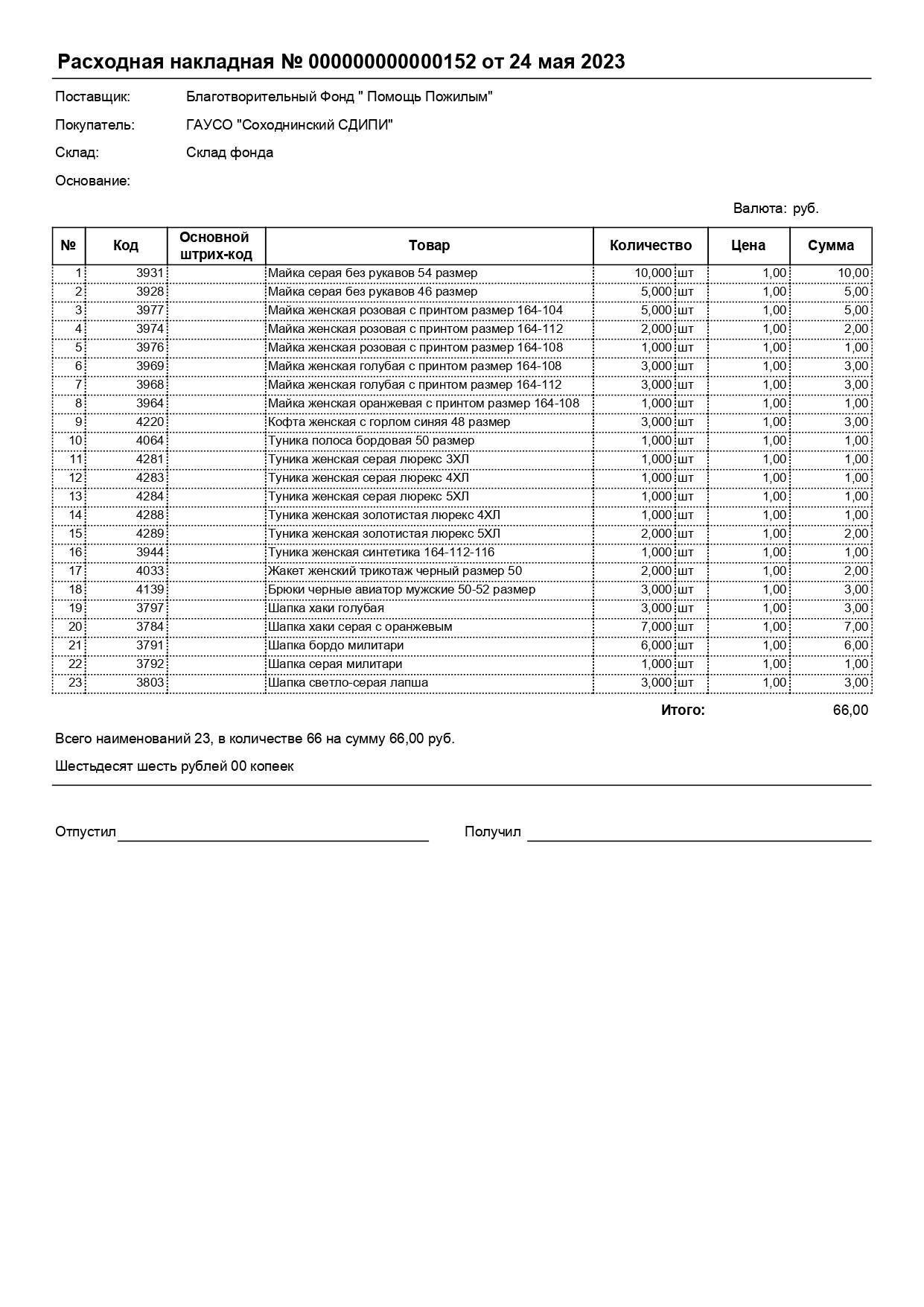 В мае 2023 г. в Фонд поступила заявка от Государственного автономного учреждения социального обслуживания «Сохондинского специального дома-интерната для престарелых и инвалидов» Забайкальского края о выделении вещевого резерва для своих подопечных. В ходе рассмотрения заявки, Советом фонда было принято решение об оказании благотворительной помощи дому-интернату. 26 мая фонд отправил посылку с новыми, качественными вещами для подопечных Сохондинского дома-интерната.