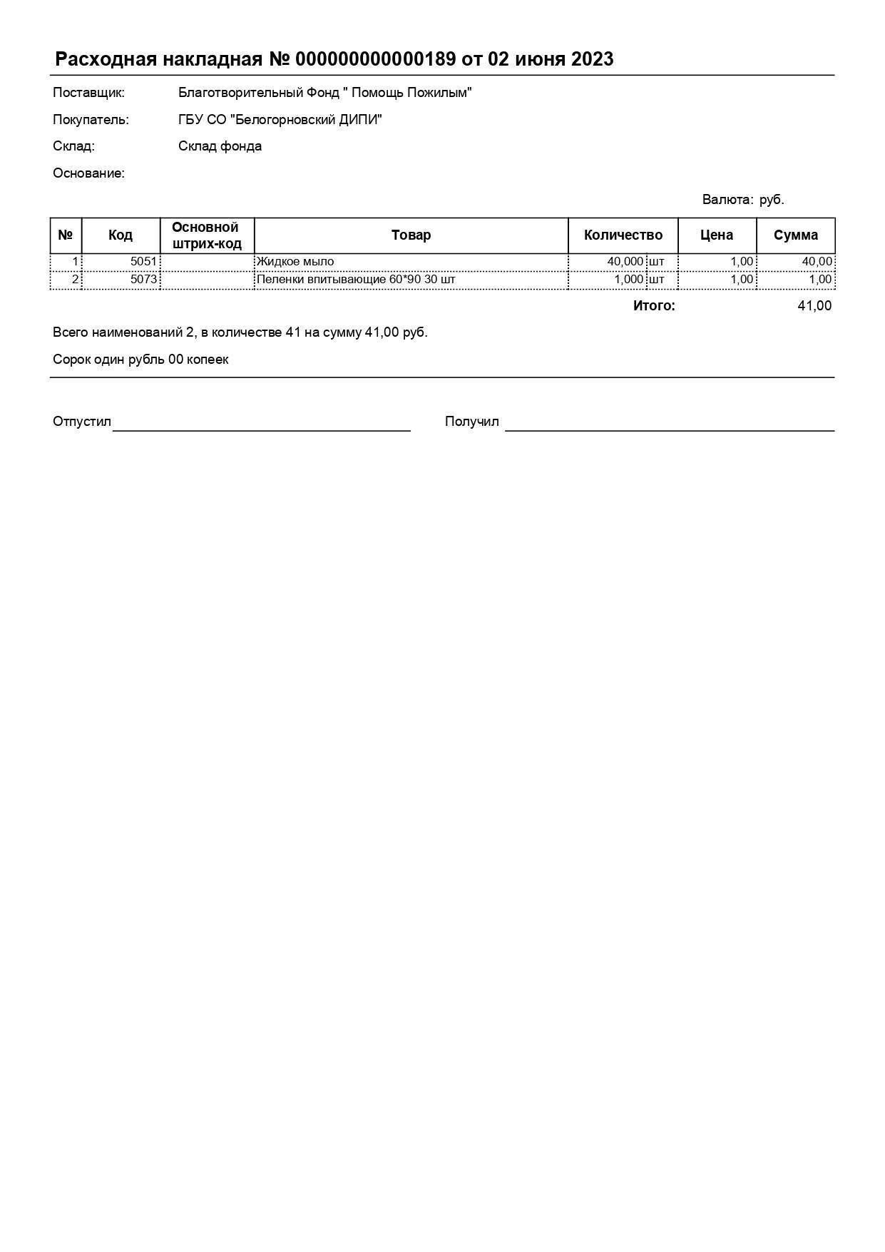 07 июня 2023 г. Фонд отправил коробки с жидким антибактериальным мылом "Айкап", пеленки впитывающие, вещевой резерв в ГБУ СО "Белогорновский ДИПИ". Фонд оказывает помощь стационарным учреждениям, которые осуществляют уход за пожилыми людьми, вне зависимости от принадлежности и местонахождения.